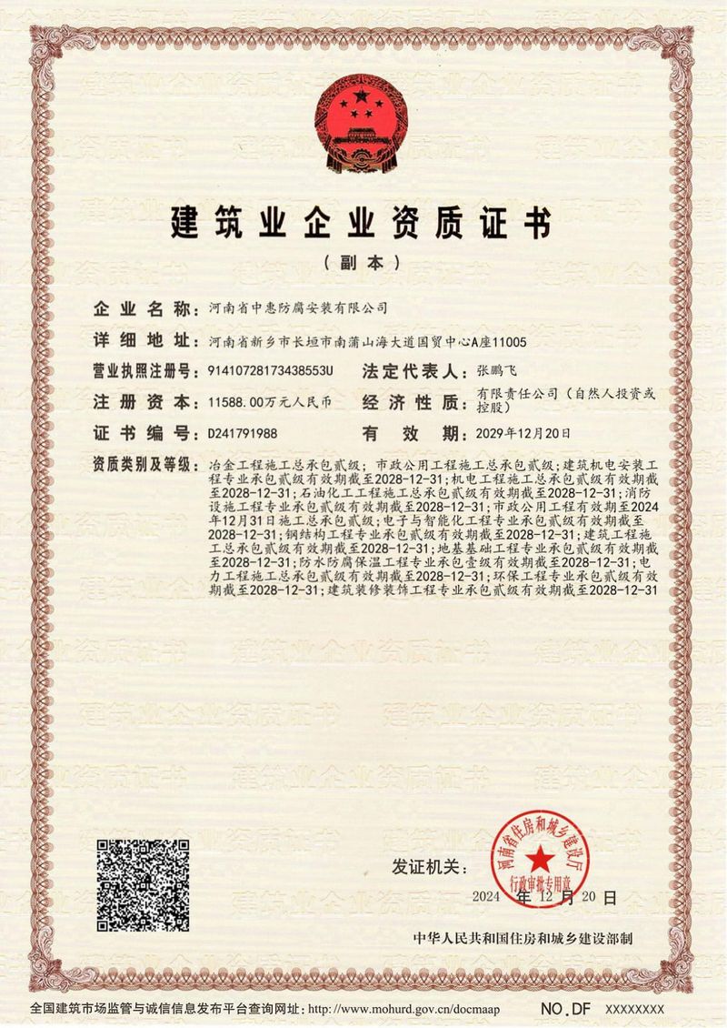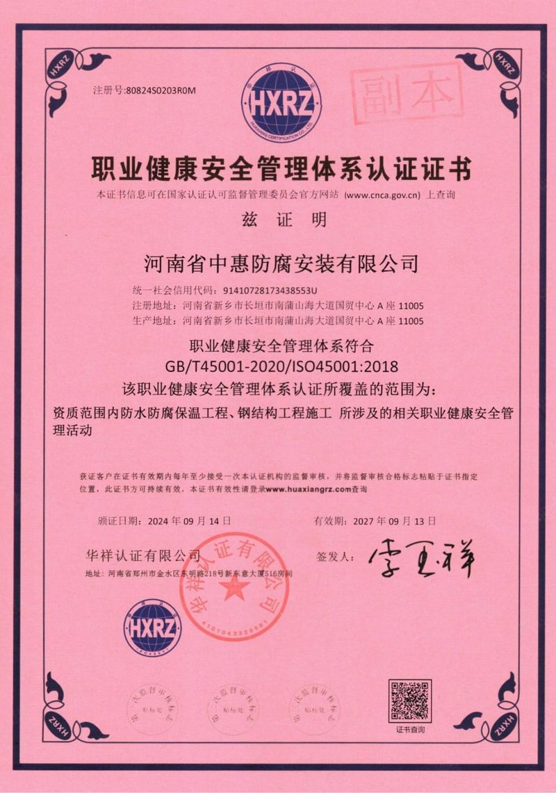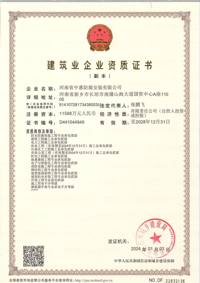 中惠防腐 · 承接各類防水防腐保溫工程公司經營范圍:防水防腐保溫工程;消防設施工程;建筑裝修裝飾工程;建筑機電安裝工程;電力工程;建筑工程;石油化工工程;工業清洗工程;油罐清洗工程;鋼結構工程;環保工程;模板腳手架工程;電纜防火封堵、防污閃噴涂、外墻外保溫工程;各類施工勞務作業;設備維修、船舶鉚焊、涂裝;電力工程材料、建材、防水材料、防火材料、防腐保溫材料銷售,并相繼通過了GB/T19001-2008idtISO9001:2008GB/T50430-2007質量管理體系認證證書。GB/T24001-2004idtISO14001:2004環境管理體系認證證書。GB/T28001-2011idtOHSAS18001:2007職業健康安全管理體系認證證書。公司是中國防腐蝕于防護協會、中國施工企業管理協會、電力協會和中國鋼結構防水協會會員單位。